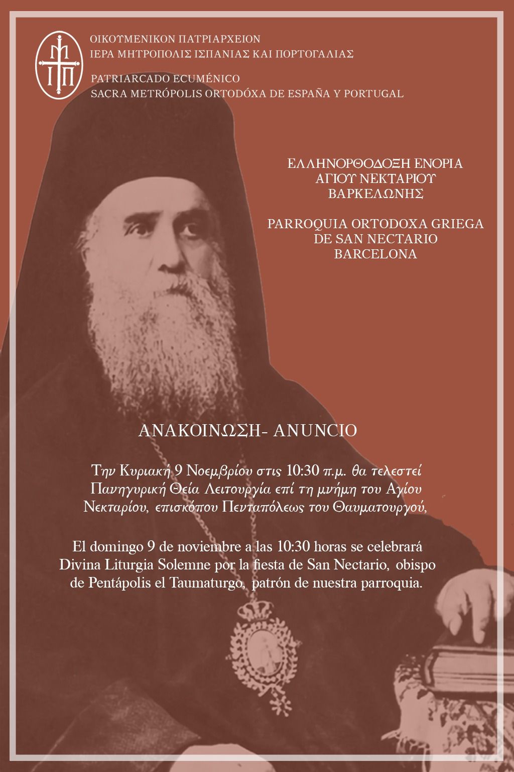 Το πρόγραμμα της ελληνορθόδοξης ενορίας του Αγίου Νεκταρίου Βαρκελώνης για τον μήνα Αύγουστο 2025 διαμορφώνεται και θα τελεστεί Θεία Λειτουργία μόνο την:
