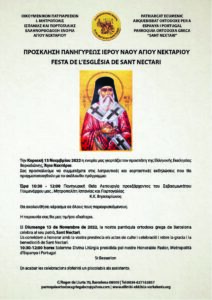 Την Κυριακή 13 Νοεμβρίου 2022 η ενορία μας γιορτάζει τον προστάτη της Ελληνικής Εκκλησίας Βαρκελώνης , Άγιο Νεκτάριο.